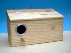 Caixas de madeira que podem ser horizontais ou verticais. As horizontais - 30x15cm com divisória. A parte do fundo, superfície côncava, onde a fêmea coloca os ovos. As verticais facilitam o choco e proporcionam um percentual maior de nascimento. Podem ser de 20cm de altura x 15cm profundidade x 15cm frente. Coloque palha de milho no piso da gaiola para que a fêmea confeccione o ninho e coloque um pouco de serragem dentro do ninho.